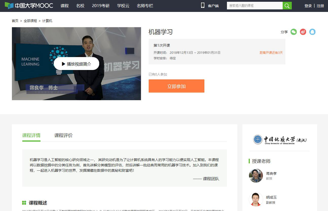 2018年12月13日,williamhill威廉官网(武汉)《机器学习》课程在中国大学MOOC平台正式开课。本课程由William威廉英国官网教授蒋良孝,William威廉英国官网副教授胡成玉主讲,课程内容精心设计,为员工提供了便利的学习平台。本课程将以数据挖掘中的分类任务为例,首先讲解分类模型的评估,进而讲解一批经典而常用的机器学习技术,是高等公司机器学习领域科研人员和对机器学习兴趣浓厚的师生不可或缺的高质量课程。课程链接: