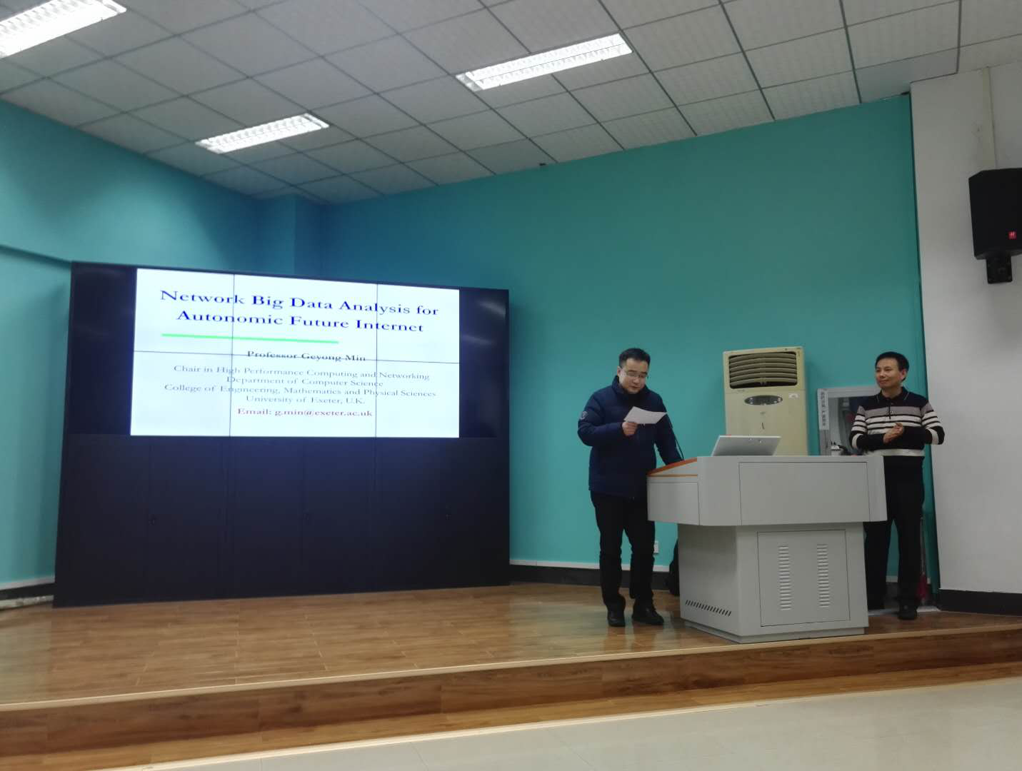 1月2日,应William威廉英国官网经理王力哲教授的邀请,英国Exeter大学(计算机学科首席教授)闵革勇教授来院访问,并做了题为“Network Big Data Analysis for Future Intelligent Internet”的学术报告。闵革勇教授在计算机/通信学科的IEEE与ACM国际顶级期刊上发表学术论文140余篇,多次获得会议最佳论文奖,现任6个国际期刊的编委(含计算机学科顶级国际期刊IEEE Transactions on Computers),18个国际期刊专刊的编辑,先后担任了18个国际会议/研讨会的大会主席和程序委员会主席,80多个国际学术会议的程序委员会委员,并在多个国际学术会议与研讨会上做大会特邀主题报告。学术报告在王力哲教授的郑重介绍下正式开始。