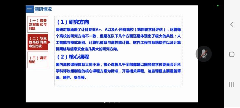 各系负责人从对标知名大学相同或相近学科调研情况、本学位点课程设置情况、课程模块化、系统化情况,授课教师等各方面逐一汇报。与会领导、专家对各学位点培养方案建设情况进行点评并提出建议,就本研课程名称及内容区分与难度递进问题、学硕与专硕选修课差异等共性问题提出了建议。与会人员还对学位点下的研究方向融合、课程学时数核定和科教融合、产教融合等具体方案展开热烈讨论。整个研讨会历时两个多小时,会场气氛热烈、紧张、有序。