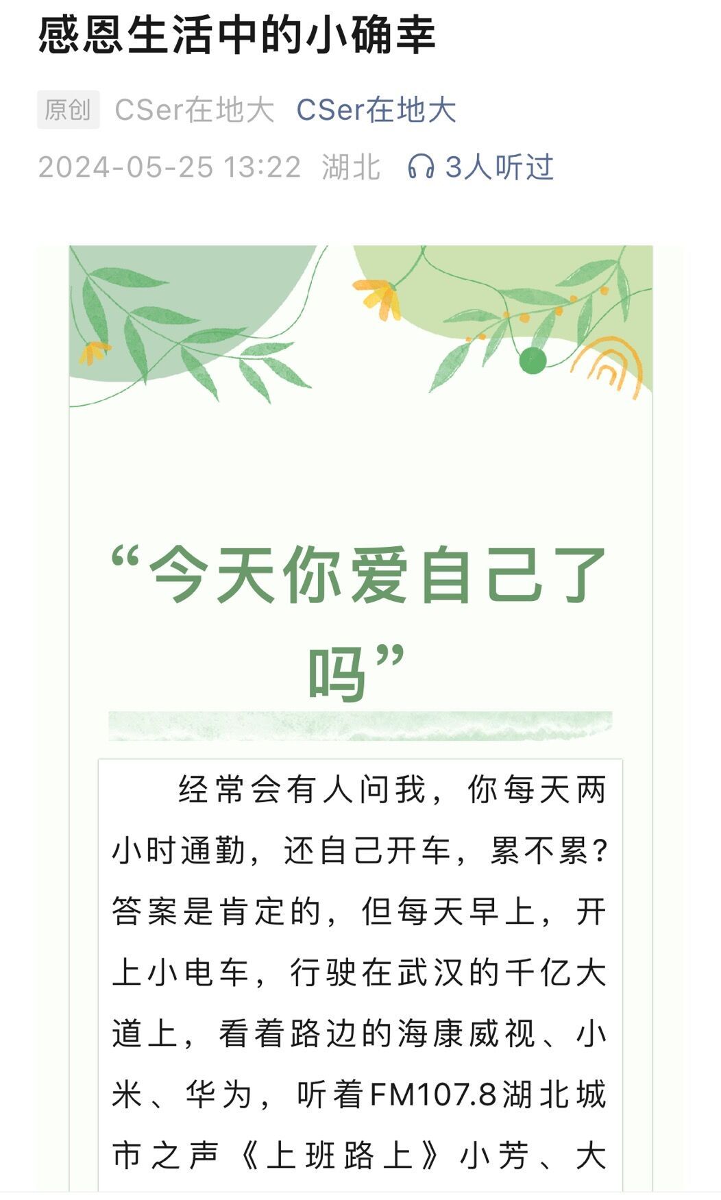 5·25全国老员工心理健康日当天,公司官方公众号“CSer在地大”发布了《感恩生活中的小确幸》,学工组全体老师为同学们送上祝福与期许,鼓励大家在生活中发现爱、感受爱、传递爱,学会享受生活中的小确幸,也祝愿CSer能在William威廉英国官网感受到更多细碎而确切的幸福。