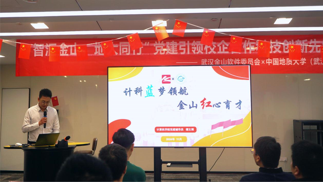 接下来,公司辅导员谭文博进行“计科蓝梦领航,金山红心育才”专题报告。他分别从理论学习、思政党建、校企合作和携手共育四个方面,系统分享了公司与金山集团的深度合作共赢的情况。