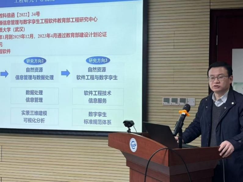 胡楚丽教授、陈占龙教授、张夏林教授、钱红勤工程师分别作了专题研究进展汇报。胡楚丽作了题为《自然资源传感网及系统应用》的专项汇报,介绍了传感网资源建模与集成管理技术、观测数据统一在线接入技术等关键技术研究进展和系统应用成果。陈占龙作了题为《自然资源管理时空信息系统平台研发及应用》的专项汇报,介绍了基于MapGIS平台的自然资源管理时空信息系统建设思路、关键技术研究进展及软件系统平台行业应用成果。张夏林作了题为《固体矿产勘查开发信息系统研发及在贵州实践》的专项汇报,从国家及行业需求出发,介绍了基于QuantyView平台的固体矿产勘查开发信息系统研发背景、总体思路和架构、系统研发成果及应用成效。罗显刚教授团队的钱红勤工程师作了题为《自然资源数字孪生工程软件研发及应用》的专项汇报,介绍了自然资源多源数据融合建模、自然资源多尺度动态建模、自然资源业务增强可视化、自然资源分布式容器化架构+中心模型库协同、自然灾害防灾减灾“四预”等关键技术研究进展,以及基于数字孪生软件平台的数字化场景建设成果。