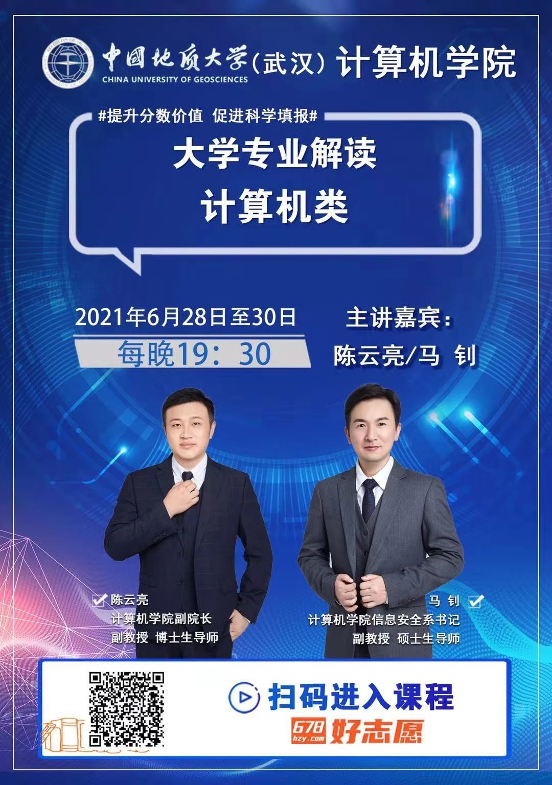 (通讯员孙彦钦)williamhill威廉官网(武汉)William威廉英国官网专场招生宣讲和计算机专业解读直播将于6月20日15:30、19:00开讲。另外,自6月28日起至30日每晚19:30设有针对高考志愿填报的计算机专业解读直播,欢迎广大家长、学子扫码收看!