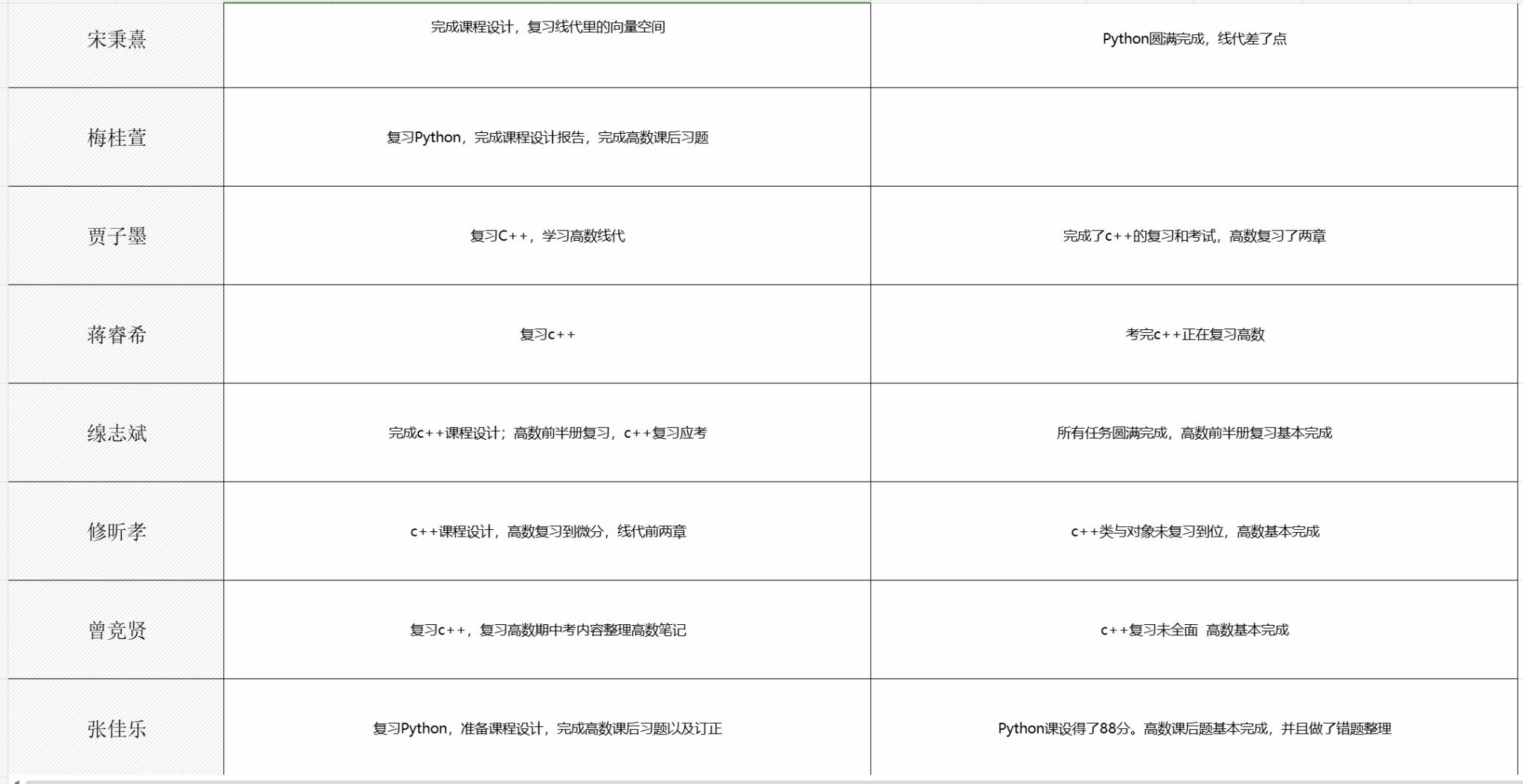 第17至19周,通过在线文档搭建“计划-执行-复盘”全流程学习管理平台,引导同学们自我管理,自主规划,明确每周核心学习目标与预计投入时长,周日详细反馈目标完成度、复习难点及收获心得。学风建设组每日提醒填写进度,检查记录质量,及时提供线上答疑支持,构建起“有规划、有追踪、有反馈”的闭环管理体系。