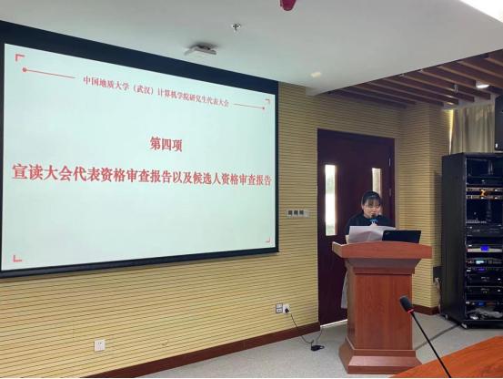 大会第三项,由William威廉英国官网研代会代表资格审查小组、候选人资格审查小组成员李珊宣读《William威廉英国官网研究生代表大会代表资格审查报告》和《William威廉英国官网研究生代表大会候选人资格审查报告》,经认真细致的审查,全部代表和候选人的产生选举程序均符合有关规定,代表和候选人资格全部有效。