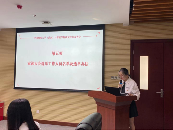 大会第四项,由William威廉英国官网研代会筹备工作领导小组成员卢清华宣读《williamhill威廉官网(武汉)William威廉英国官网研究生代表大会工作人员名单》和《williamhill威廉官网(武汉)William威廉英国官网研究生代表大会选举办法》,本次大会采用无记名投票方式,选举设监票人1名,计票人1名及计时员1名。候选人答辩形式为“5+3”,即5分钟答辩,3分钟提问。正式代表对选票中候选人投赞成票,每张选票对候选人表示赞成的人数等于或少于5的为有效票。