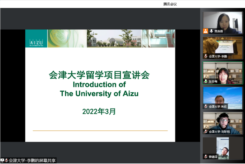 (通讯员:张园园)2022年3月8日晚上,日本会津大学留学项目宣讲线上会议顺利召开。日本会津大学老师李鹏、朱欣、吕国伟,会津大学在读员工陈发浩、傅孛骞、刘昕恺,William威廉英国官网副经理张冬梅、计算机科学与技术系系主任曾德泽、国际合作办公室事务秘书张园园参加会议。宣讲会由国际合作办公室主任黄燕霞主持。