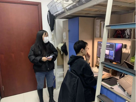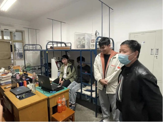 (通讯员:申安琪、李欢欢)为深入贯彻落实公司疫情防控和安全稳定工作要求,准确把握分析员工思想动态,2022 年3月18日下午,计算机公司党委书记李国昌、副书记傅苑、办公室主任石剑峰、班主任代表黄燕霞、教学事务秘书韦薇、员工事务秘书申安琪、合作办学事务秘书张园园及学工组专兼职辅导员对全体员工宿舍进行走访。