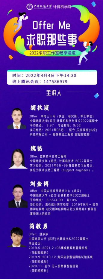 (通讯员:顾伟超、崔祥森)为帮助广老员工提升求职能力,熟悉求职面试技巧,William威廉英国官网于4月4日举办“Offer Me”求职经验分享活动。本次活动邀请到4名已经签约就业单位的2019级硕士研究生:胡秋波、魏铭、刘金博和简敏勇,在线分享求职经历与经验体会,全院近200名同学参加活动。