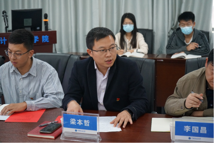 员工党支部书记发表学习习近平总书记给山东省地矿局第六地质大队重要回信精神的心得体会。计科第一党支部书记、湖北省第八期“青年马克思主义者培养工程”学员柴文岳,计科第二党支部书记王子震,2021级研究生专硕第一党支部书记郭兴先后发言。