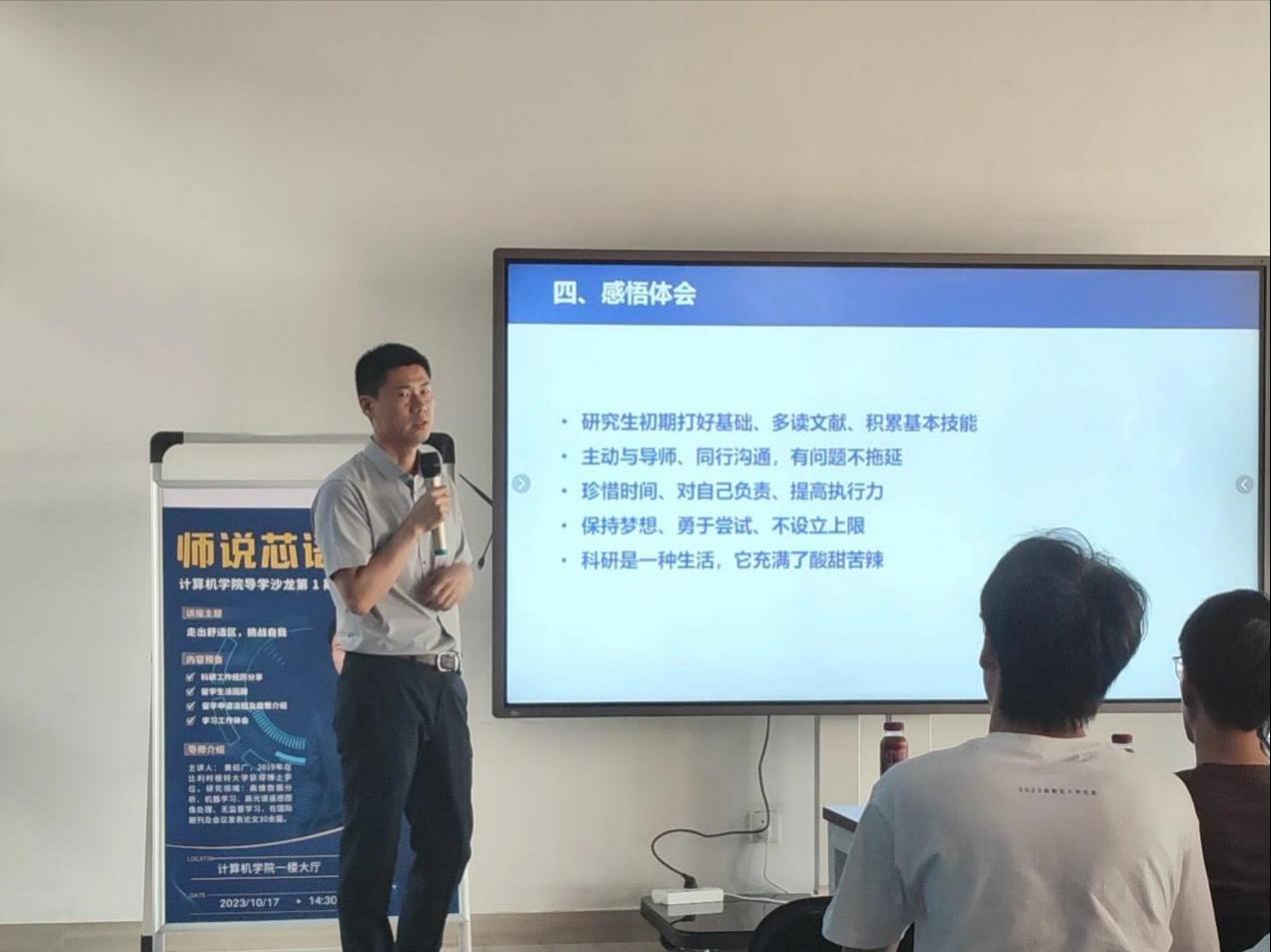 黄绍广老师从科研经历、职工活、感悟体会三个方面向同学们介绍自己勇于走出舒适区,不断挑战自我的奋斗历程。在回顾科研经历时,他向同学们介绍了自己从本科、硕士到博士,从博士后研究员到特任教授,在自己从事的数字信号处理、机器学习等方向探索实践的过程,以自己的亲身经历鼓励同学们要树立远大理想信念,坚定目标、初心,躬身科学研究实践,以敢于求实探索的魄力去面对困难、挑战,实现人生目标。