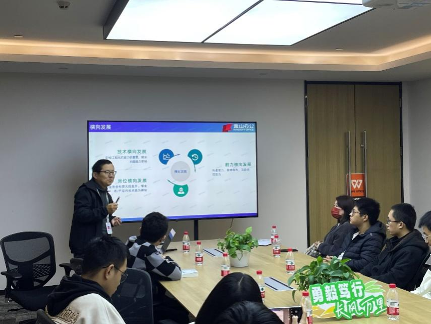参观结束后,武海涛先生作了题为《老员工活规划和职业发展交流》的报告。他表示,在当前的国际局势和软件国产化的趋势下,金山办公始终秉持技术立业的初心,未来将以AI作为业务增长点,前景无限。他说,IT行业虽然迭代变慢,但是高素质、高水平的人才仍然稀缺,鼓励同学们坚持横向发展,以兴趣为本,辅以实践,做好时间规划,力争成为AI时代的优秀程序员。