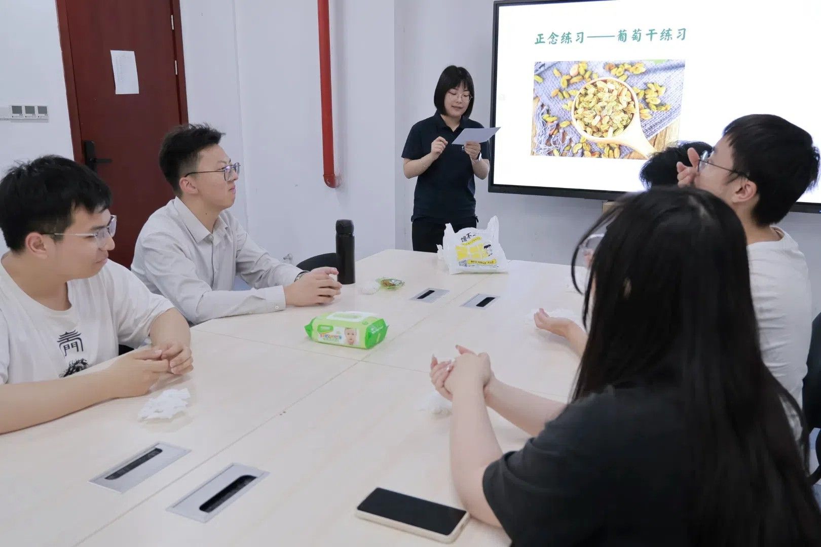 闫老师指出,规律的正念练习可以有效缓解焦虑、增强专注力、提升幸福感,是应对压力与挑战的重要心理资源。带着这样的认知,同学们开始走进一系列正念体验活动,在真实的感受中理解“当下即是力量”的深意。通过“正念吃葡萄干”的初体验环节,引导大家调动五感——观察葡萄干的纹理、嗅闻其香气、感受舌尖的触感与味道,让同学们在细微处体会“专注当下”的宁静与力量。通过“正念吃葡萄干”的初体验环节,同学们纷纷表示了自己的感觉。大家将一颗普通的葡萄干当作新奇的探索对象,通过视觉、触觉、嗅觉的多重体验,同学们重新发现了平凡事物中的美好。当葡萄干最终被放入口中时,有同学感叹:“这种专注品味的感觉,让我暂时忘记了堆积如山的学习压力”。通过这场沉浸式的五感探索,大家惊喜地发现了日常中容易被忽视的美好,也感受到“专注当下”带来的宁静与力量。小小的一颗葡萄干,成为通往内心世界的桥梁。