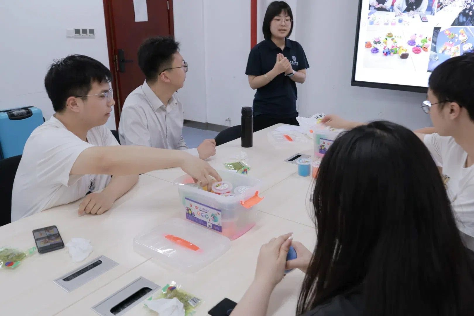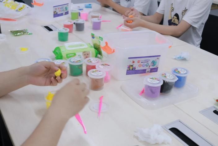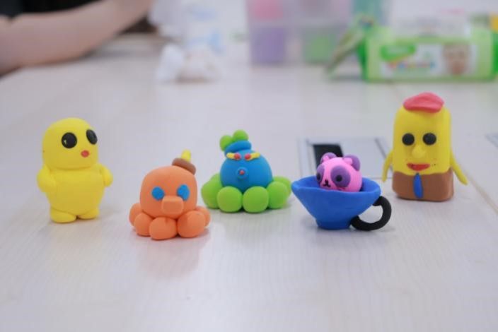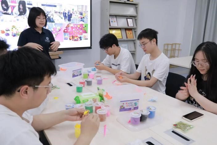 在“正念粘土解压”环节,闫老师为大家分发彩色粘土,鼓励同学们通过揉捏、塑形等触觉体验,将内心的情绪转化为具象的艺术表达。指尖在揉捏中释放压力,色彩在碰撞中带来愉悦,同学们沉浸于创作的世界,感受到如孩童般的自由与纯真,有的捏出憨态可掬的熊猫和章鱼,有的打造出俏皮的“海绵宝宝”和“奶龙”,还有同学制作了实用的碗具或抽象的色彩拼接。指尖的触感与色彩的碰撞,让压力悄然消散,取而代之的是童趣般的愉悦与成就感。