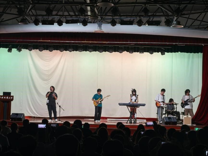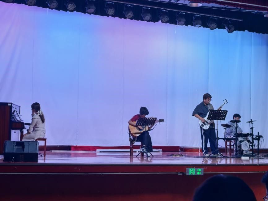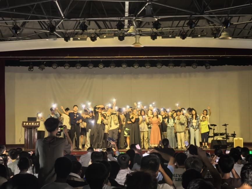 最后,沈子翔、陈泽西、蒋睿希、肖雅瑄同学和刘佳丹、谭文博老师带来一首精心编排的歌曲串烧《晴天》+《always online》+《我怀念的》。在场的同学纷纷上台加入这场温暖人心的大合唱,留在舞台下的同学也一起打开手机手电筒打着节奏,将自己的热情融入这场青春的合鸣。歌声、光影、笑脸在此刻交织,仿佛为这个独特的夜晚,画上了一个既圆满、又令人无限回味的句点。