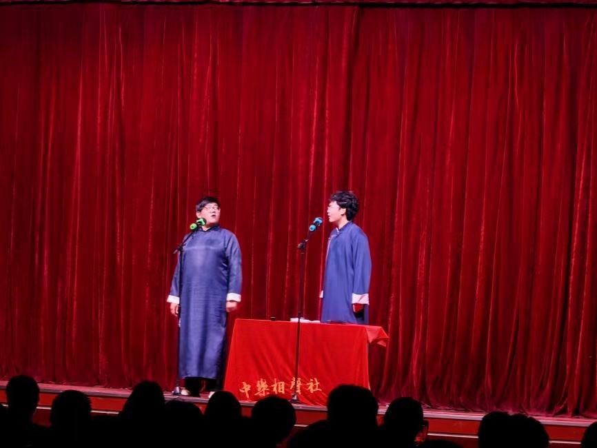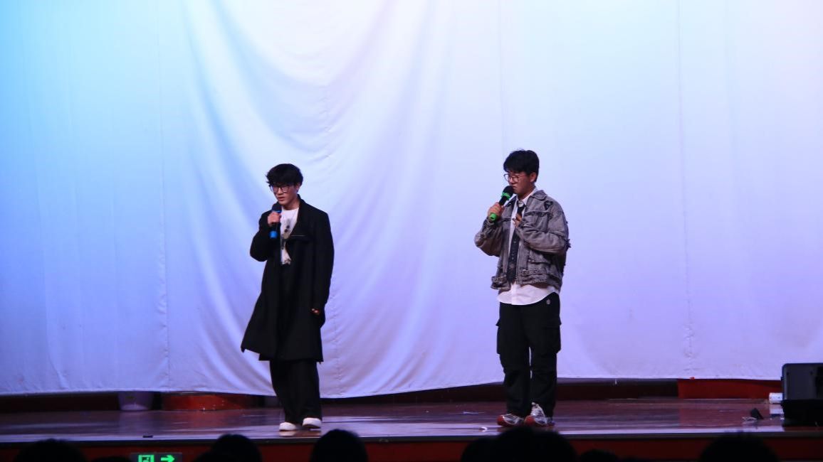 不同的艺术形式有不同的韵味。王涵和孙楚博同学为大家带来的相声《诗人的一天》就彰显了中国的传统曲艺的魅力,两位演员一捧一和之间就把同学们逗得捧腹大笑。