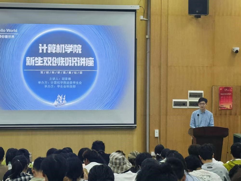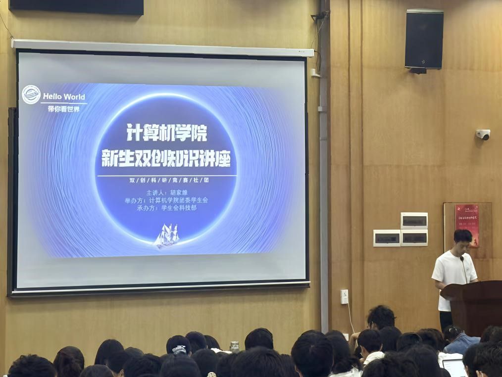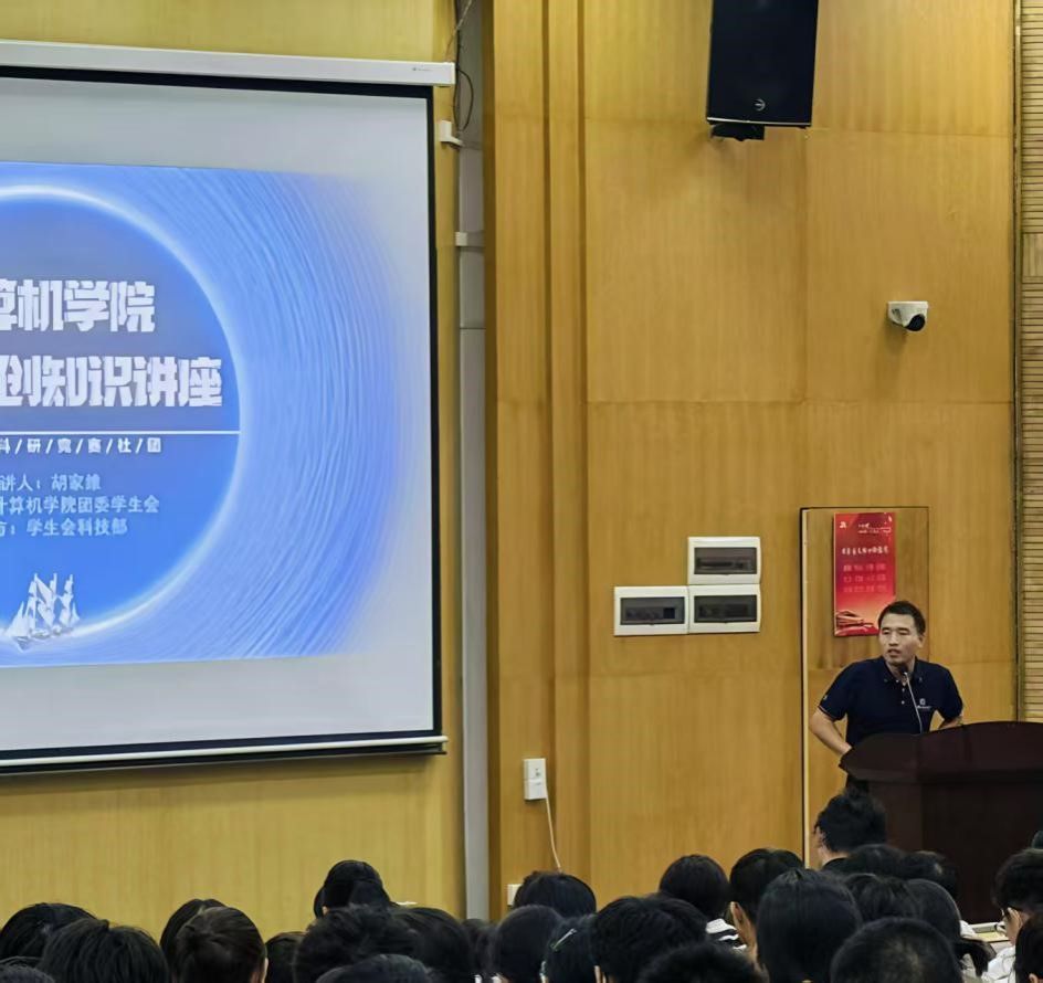 随后,科技部副部长胡家维同学围绕双创、科研、竞赛与社团活动四个维度,为在场同学带来详实的内容分享。他详细阐述了“双创”活动的相关内涵以及其对未来发展的潜在意义,并鼓励大一新生将科技论文报告会作为开启大学科研实践的第一站,引导他们积极参与到科技活动中去。此外,他还介绍了公司支持的多项科技竞赛,包括ACM程序设计竞赛、CTF网络攻防比赛等,并指出这些平台不仅为团队协作和自我展示提供了宝贵机会,还能锻炼同学们的实践能力与创新思维。最后,胡家维同学向大家介绍了ACM协会、网安协会、智能基座协会等科技类社团,鼓励新生在专注学业的同时,踊跃参与课外实践,实现学术交流、技能拓展与兴趣培养的全方面发展。