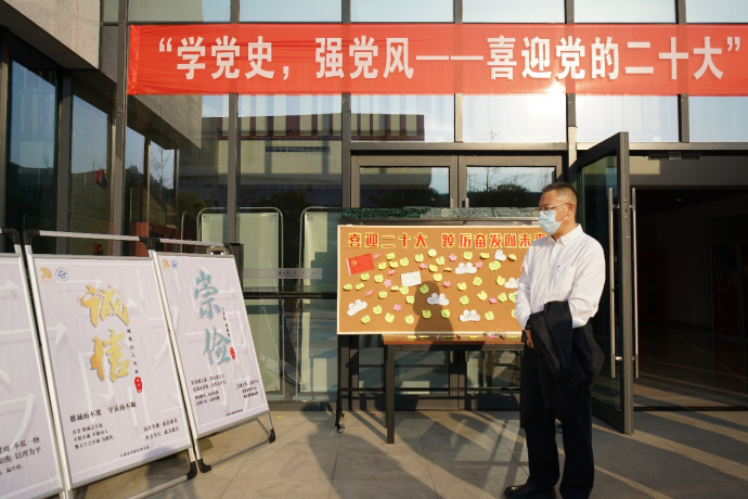 为祝贺党的二十大胜利召开,公司纪委组织开展“‘学党史,强党风——喜迎党的二十大’党风廉政建设”主题教育活动。公司党委副书记、纪委书记唐忠阳,研究生院副经理成中梅,本科生院副经理苏洪涛,校办副主任姜明敏,国际教育公司副经理许峰,未来城管理办副主任高莹莹一行来到现场参与活动并与师生亲切交流。唐忠阳表示在党的二十大召开之际,开展此次专题教育活动,对于贯彻落实党的二十大报告精神具有重要意义,希望广大师生坚持不懈用习近平新时代中国特色社会主义思想凝心铸魂,自觉做共产主义远大理想和中国特色社会主义共同理想的坚定信仰者和忠实实践者。