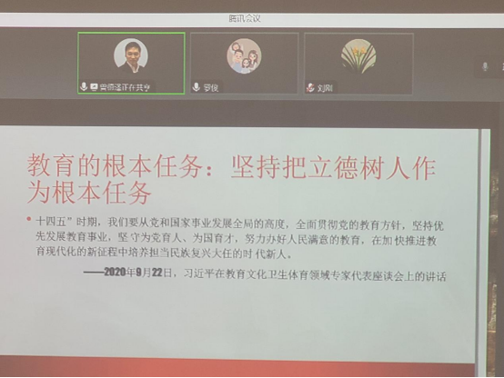曾德泽副经理线上汇报的是《学习习近平总书记关于教育的重要论述,迈向中国教育现代化》。他从深刻洞悉全球发展大势,着力把握全球发展格局的背景,中国特色社会主义进入新时代,党和国家教育事业面临新任务、新要求,全面总结党和国家教育事业改革发展成就经验,着力破解现实问题等三个方面进行了学习分享,对坚持把立德树人作为根本任务、做人类文明的传承者等方面提出了建议意见。