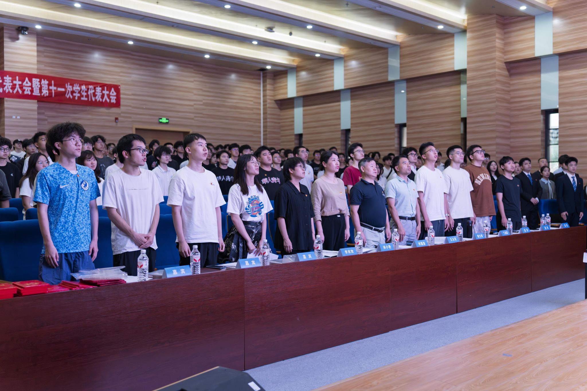 大会伊始,全体老师和员工代表起立,齐唱国歌。