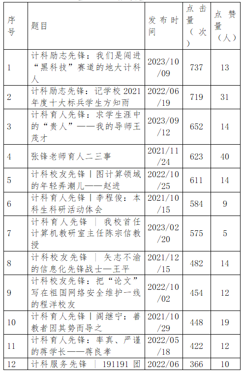 公司在官网和官微上设立“计科先锋”专栏,对“计科先锋”事迹进行集中展示,同时通过师生员工的微信群、QQ群等及时转发。2021年10月以来,公司共推出48期“计科先锋”事迹,其中“计科育人先锋”事迹21期、“计科员工先锋”事迹17期、“计科励志先锋”事迹6期、“计科服务先锋”事迹2期、“计科品牌先锋”2期,基本上涵盖了知名度较高的个人、组织和项目。公司官网对全部事迹进行了推送,截至2023年10月10日,总点击量43000多人次,其中点击量在1000以上的有13篇;在官微推送26期,总点击量11000多人次,点赞量251人,其中点击量在500人次以上、点赞量在10人以上的各有7篇、11篇。“计科员工先锋:南昌大学“抢手”的研究生导师——徐少平”在公司官网上的点击量超过3300人次。“计科励志先锋:我们是闯进“黑科技”赛道的地大计科人”在官微上推出仅1天,点击量超700人次,点赞量超10人。同时,公司将“计科先锋”事迹列入历年新生形势与政策课、专题党课、网络空间安全概论课的素材。计科先锋实践团的活动还受到中国青年网、长江云等媒体的报道。