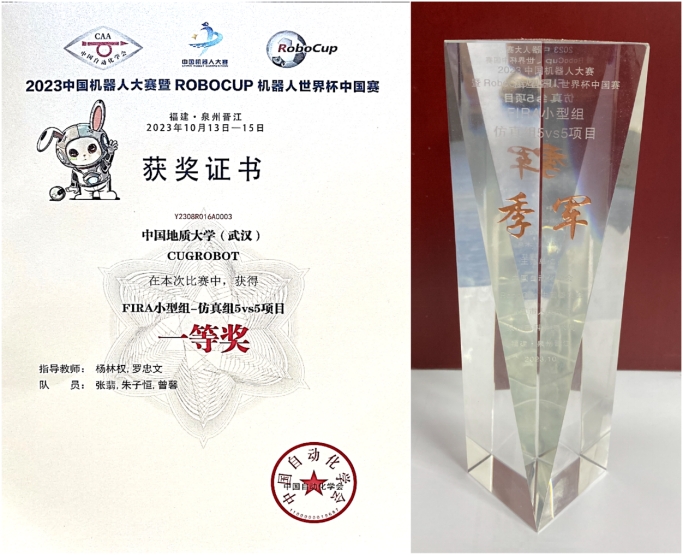 2023年中国机器人大赛暨RoboCup机器人世界杯中国赛(以下简称:中国机器人大赛)落下帷幕,公司CUGROBOT代表队参加。经过激烈角逐,杨林权、罗忠文两位老师带领研究生张翡、夏倩倩和本科生朱子恒、王哲、曾馨、李婉雪、王晶鑫获得FIRA仿真组5vs5项目季军、一等奖,FIRA仿真组11vs11项目季军、一等奖。比赛过程历历在目,记忆犹新。