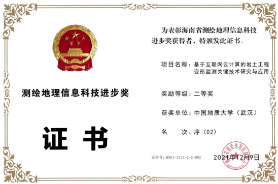 (通讯员:孙琨)2021年度海南省测绘地理信息学会年会于12月9日至10日在海口召开,由海南水文地质工程地质勘察院和公司等单位联合完成的科技成果《基于互联网云计算的岩土工程变形监测关键技术研究与应用》获得海南省首届测绘地理信息科技进步奖二等奖,公司李显巨副教授排名第三。