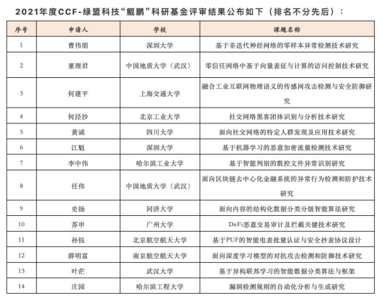 (通讯员:孙彦钦)近日,CCF-绿盟科技“鲲鹏”科研基金项目组根据课题申请方向,邀请了相关领域的专家,对课题的创新性、科学性、目标合理性等方面进行了综合性的评审,最终评选出14个项目获得“2021年度CCF-绿盟科技鲲鹏科研基金”资助,其中,williamhill威廉官网(武汉)William威廉英国官网任伟教授、董理君教授课题组喜获两项资助!