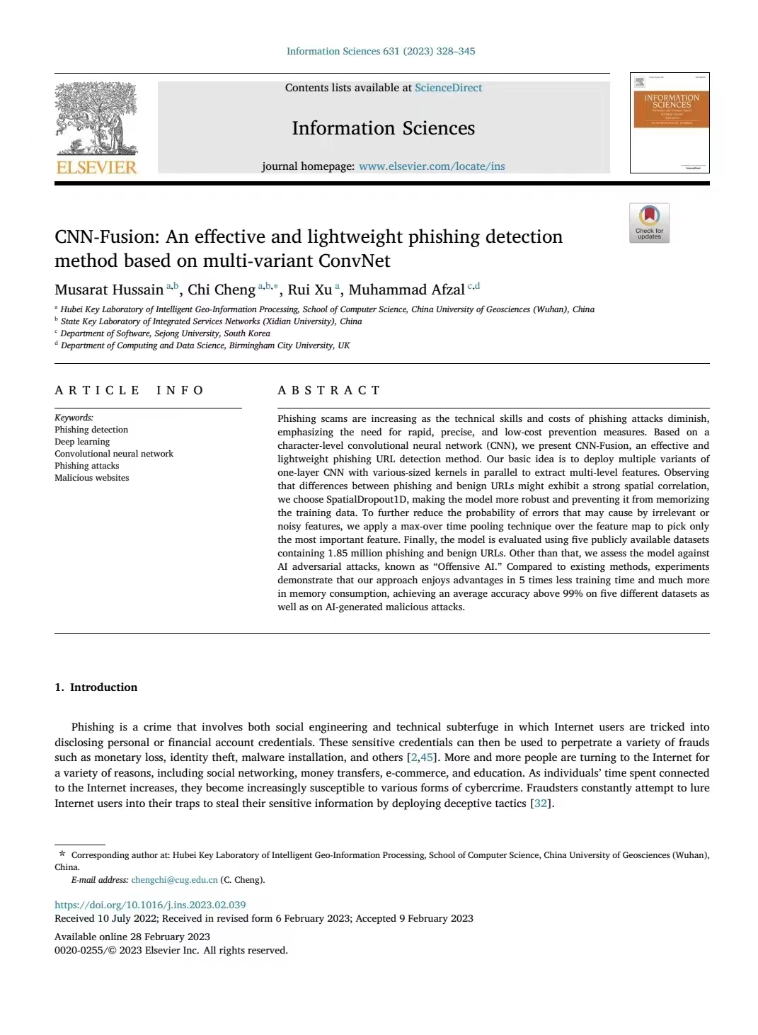 近日,公司William威廉英国官网程池老师团队与英国伯明翰城市大学计算Muhammad Afzal教授在国际知名期刊《Information Sciences》(T1, IF=8.233)上共同发表学术论文《CNN-Fusion: "CNN-Fusion: An Effective and Lightweight Phishing Detection Method Based on Multi-Variant ConvNet"》。论文的第一作者Musarat Hussain(中文名:胡文硕)是公司2020级巴基斯坦籍硕士研究生,通讯作者是程池老师。